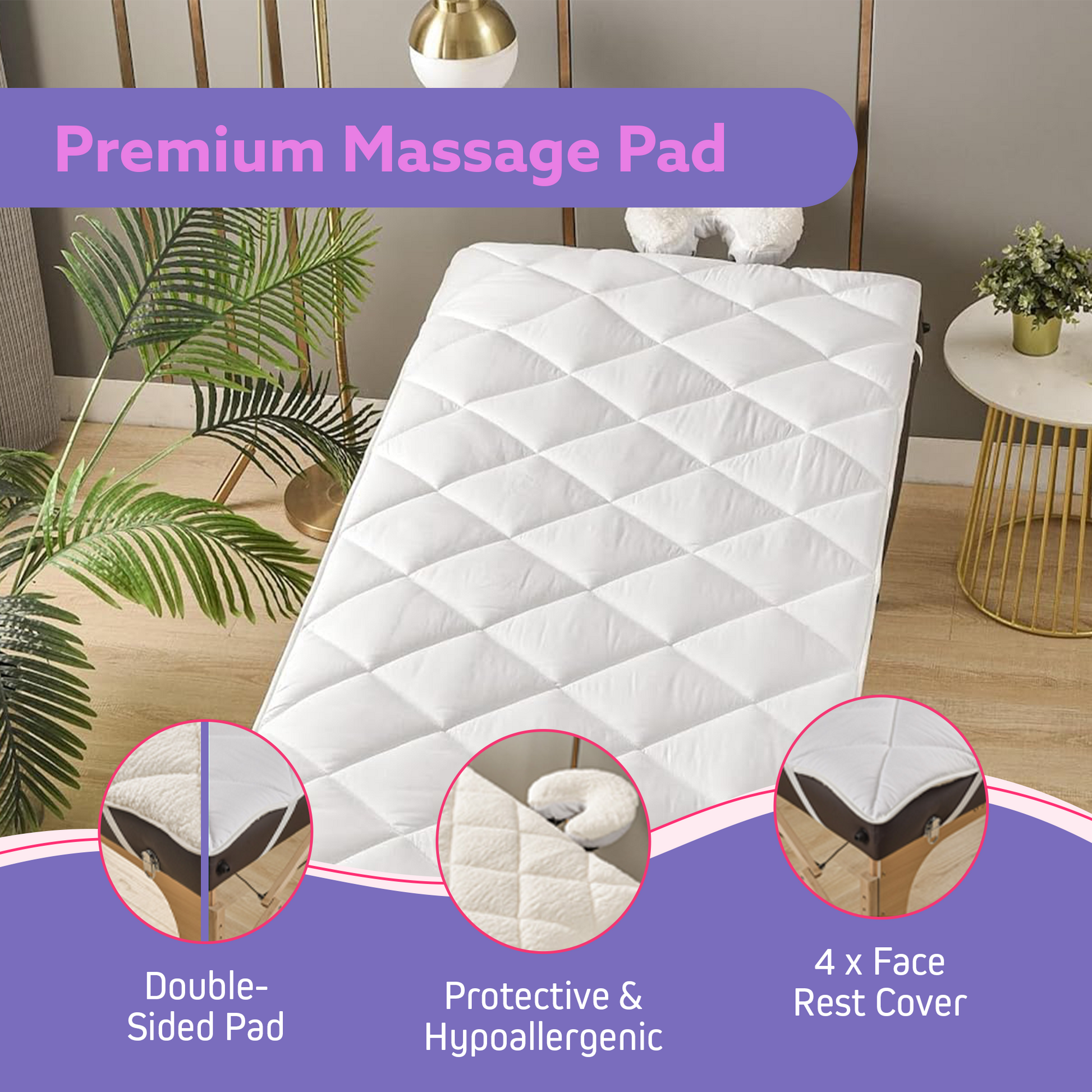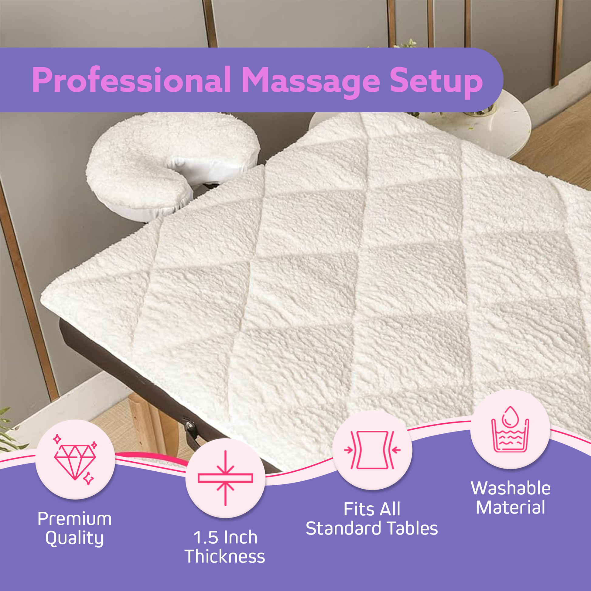 - GENEROUS SIZE & PLUSH SUPPORT – Measuring 34" x 76" (86 x 193 cm), this massage bed pad fits most standard tables. The 1.5-inch thick poly fiber fill delivers extra softness, transforming any surface into a comfortable massage table padding topper. Ideal for estheticians and therapists, it enhances comfort on facial beds and massage setups.