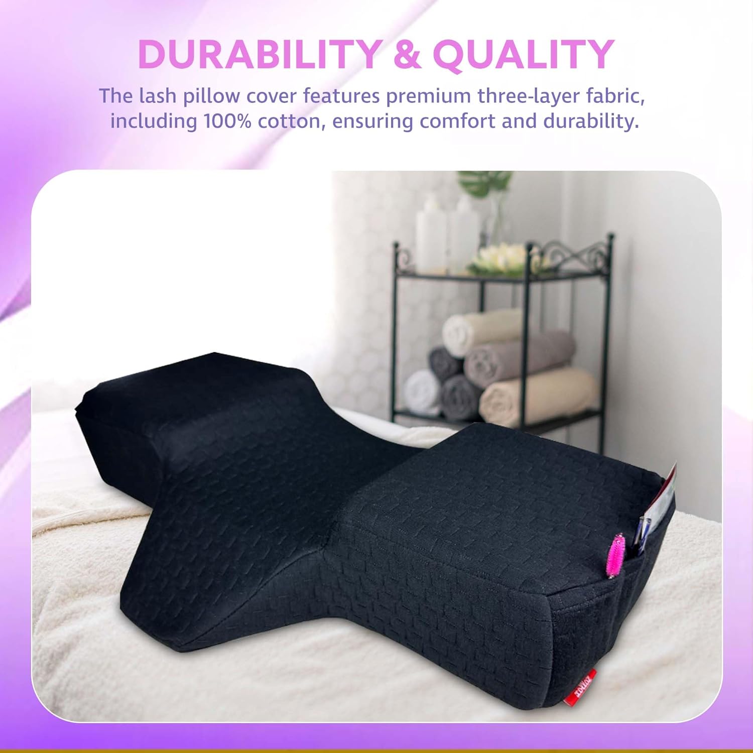 - [PREMIUM LASH PILLOW COVER] – The eyelash extension pillow comes with a high-quality, three-layer lash pillow cover. With a soft 100% cotton top layer, durable polyester middle, and breathable blended base, it offers lasting comfort and a luxurious feel, just like a beauty rest black pillow.