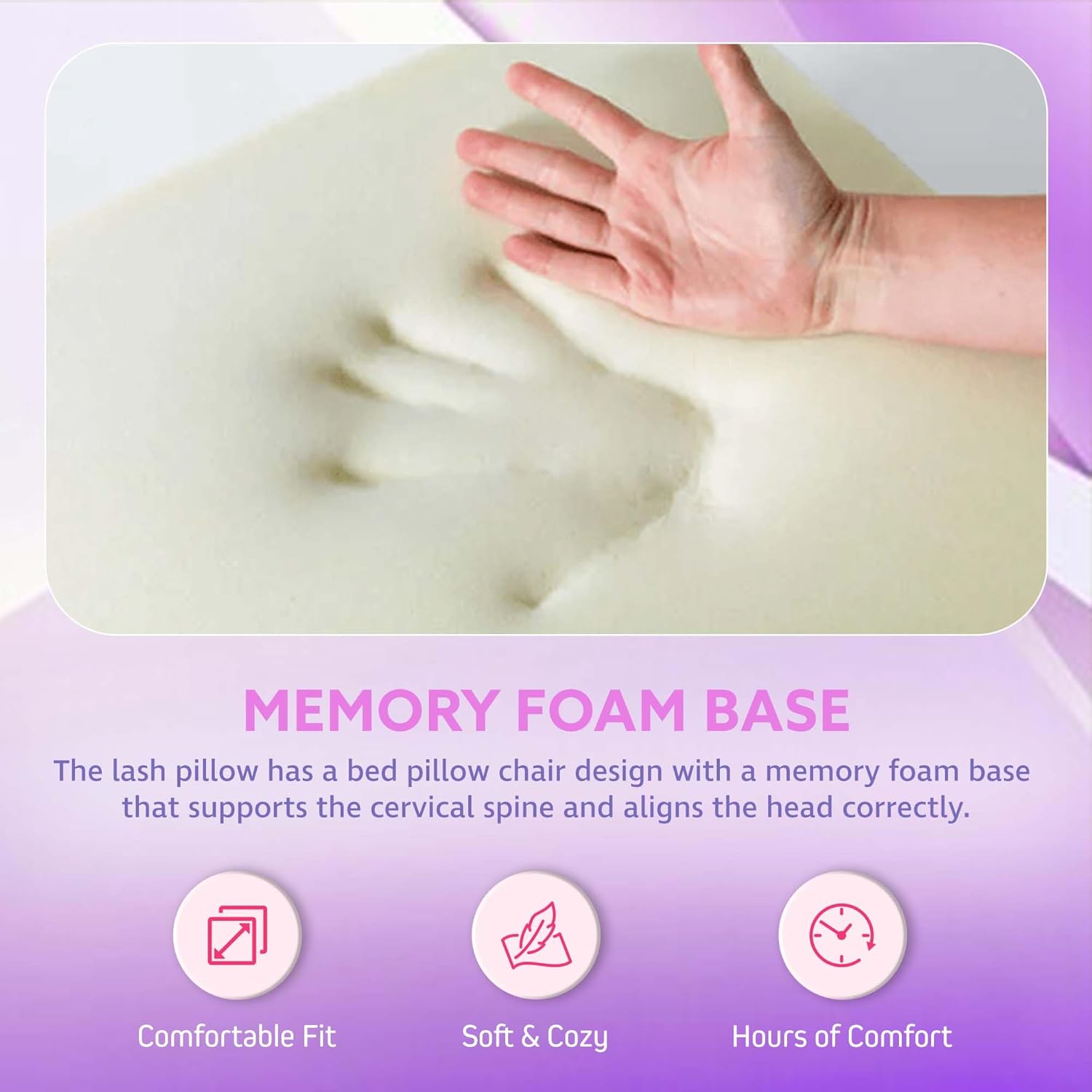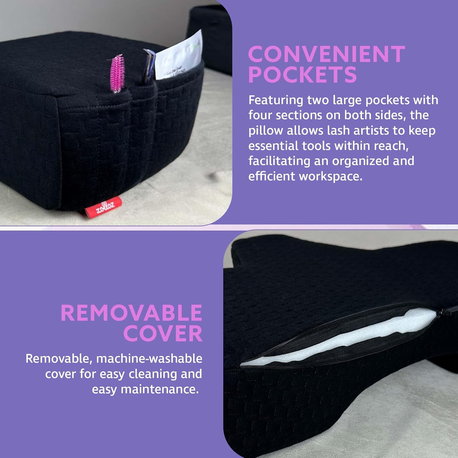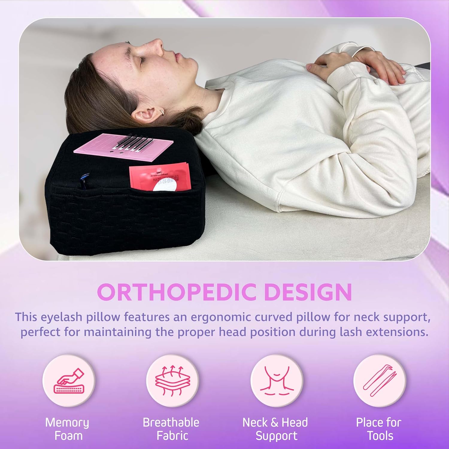 - [MEMORY FOAM CORE] – Crafted with medium-density memory foam, this lash head pillow keeps the cervical and dorsal spine in a stable position. Ideal for lash artists, it also offers side areas for organizing lash pallets and tools, enhancing speed and efficiency on any facial pillow or lash bed setup.